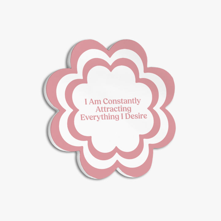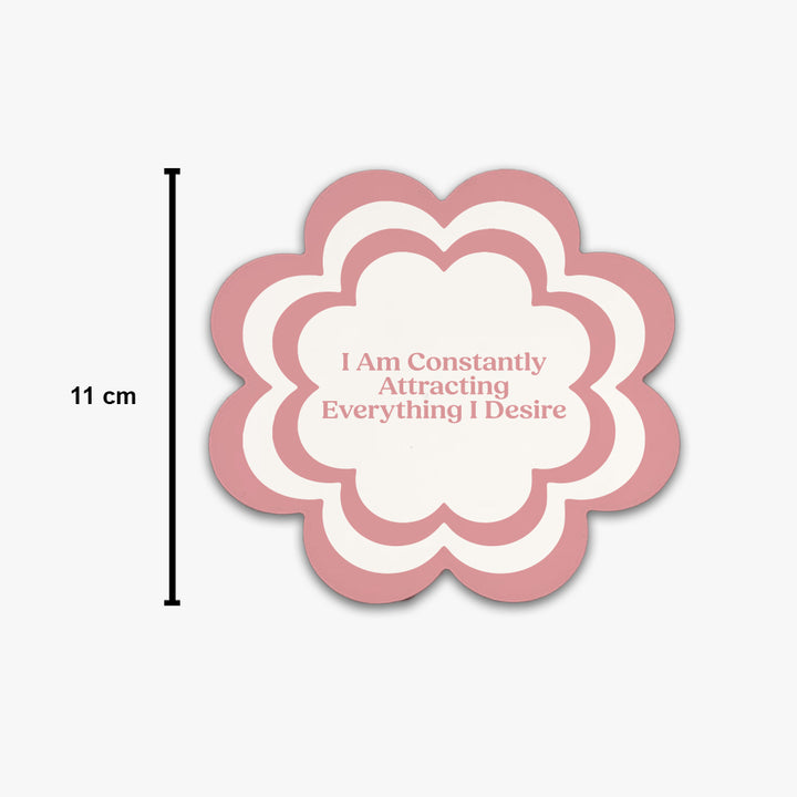 Manifest positivity and abundance in your daily life with the Affirmation Flower Ceramic Coaster: Attracting Desires. Designed in a charming layered flower shape with a soft pink and cream color palette, this coaster carries the empowering affirmation: “I Am Constantly Attracting Everything I Desire.”