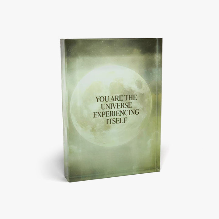 The Affirmation Glass Block: Universe Experiencing Itself offers a powerful, soul-stirring reminder of your connection to the infinite. With the ethereal message —