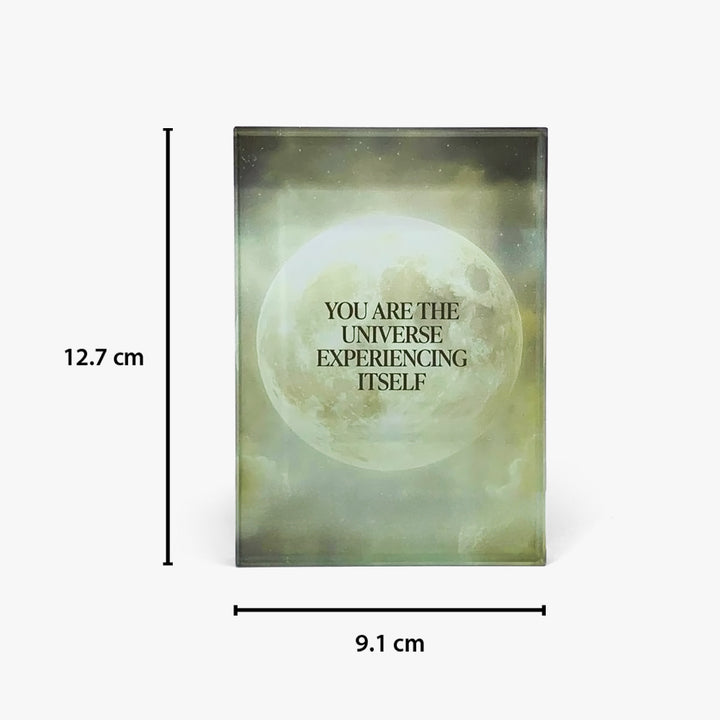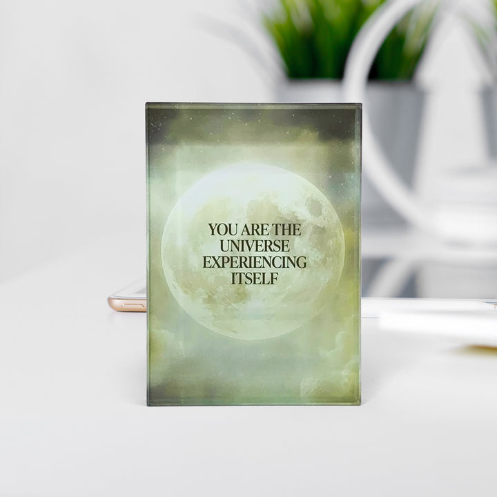 The Affirmation Glass Block: Universe Experiencing Itself brings quiet wonder and expansive truth into your daily awareness — a cosmic touchpoint for your inner journey.