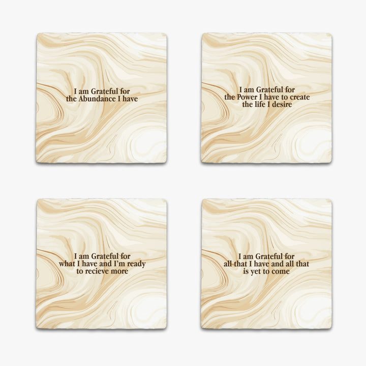 Celebrate mindfulness in your everyday routine with the Grateful Square Ceramic Coaster Set: Abundant Gratitude. This 4-piece set features elegant beige marble-inspired designs, each coaster carrying a unique gratitude affirmation to uplift your space: