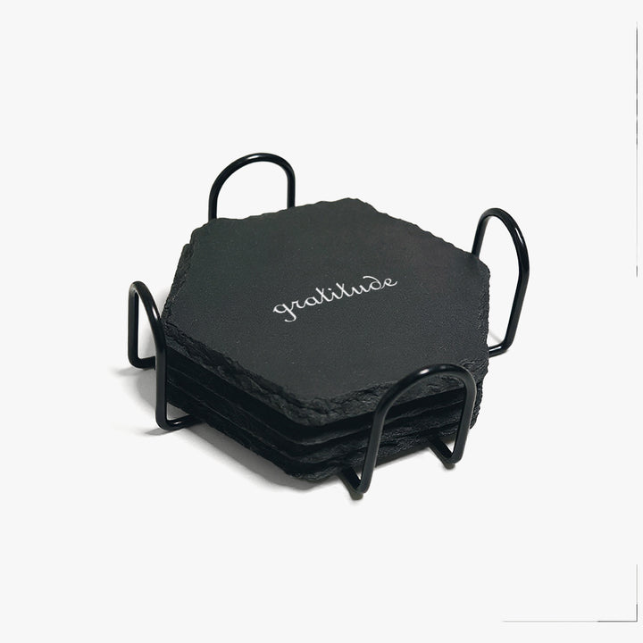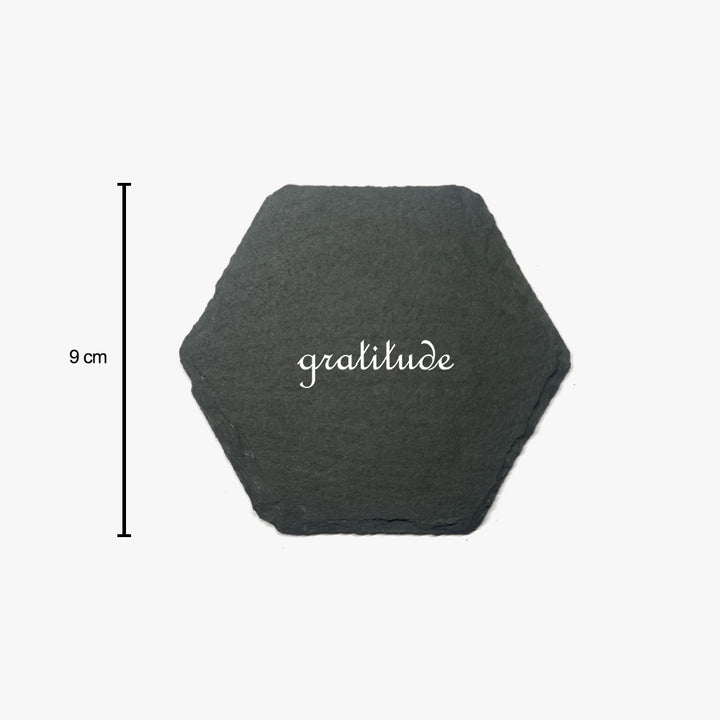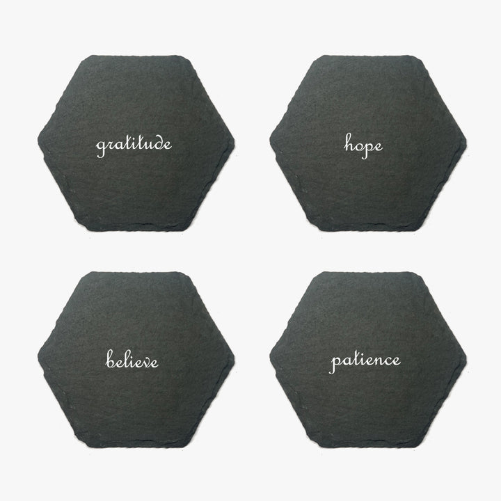 Bring elegance and positivity to your coffee table with the Inspirational Marble Stone Slate Coaster Set. Each hexagon-shaped coaster is handcrafted from natural slate stone and engraved with uplifting words — Gratitude, Hope, Believe, Patience — daily reminders to inspire mindfulness and motivation.
