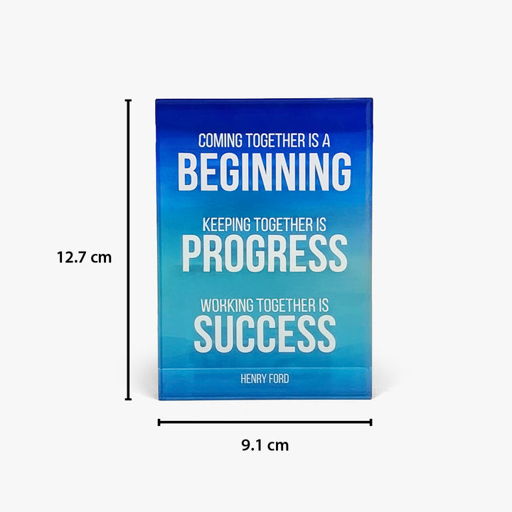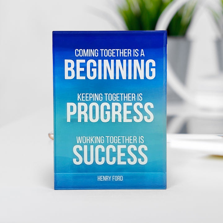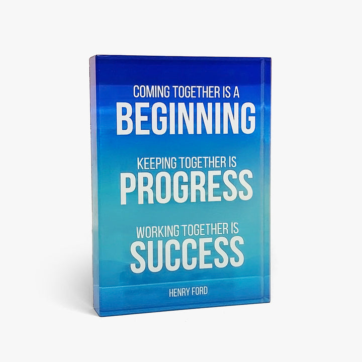 The Positivity Glass Block: Beginning, Progress & Success channels the timeless wisdom of Henry Ford into an elegant piece of daily inspiration: