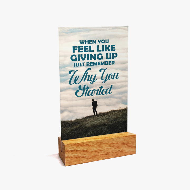 Crafted from premium acrylic glass with a natural wooden base, this motivational display combines strength, simplicity, and beauty. The scenic background of a lone figure overlooking the horizon symbolizes perseverance and clarity — making it a perfect addition to your workspace, home office, or study area.