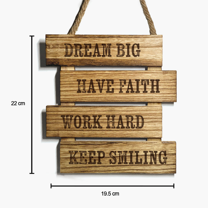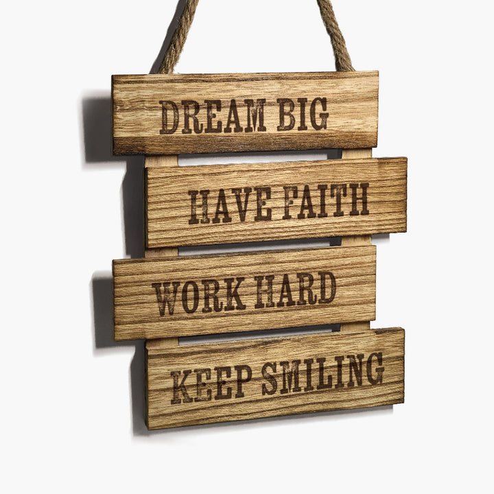 Fill your space with inspiration through the Positivity Wooden Hanging: Dream Big. Crafted from natural wood with a rustic finish, this decorative wall hanging features four uplifting reminders—Dream Big, Have Faith, Work Hard, Keep Smiling—to encourage positivity and perseverance every day.